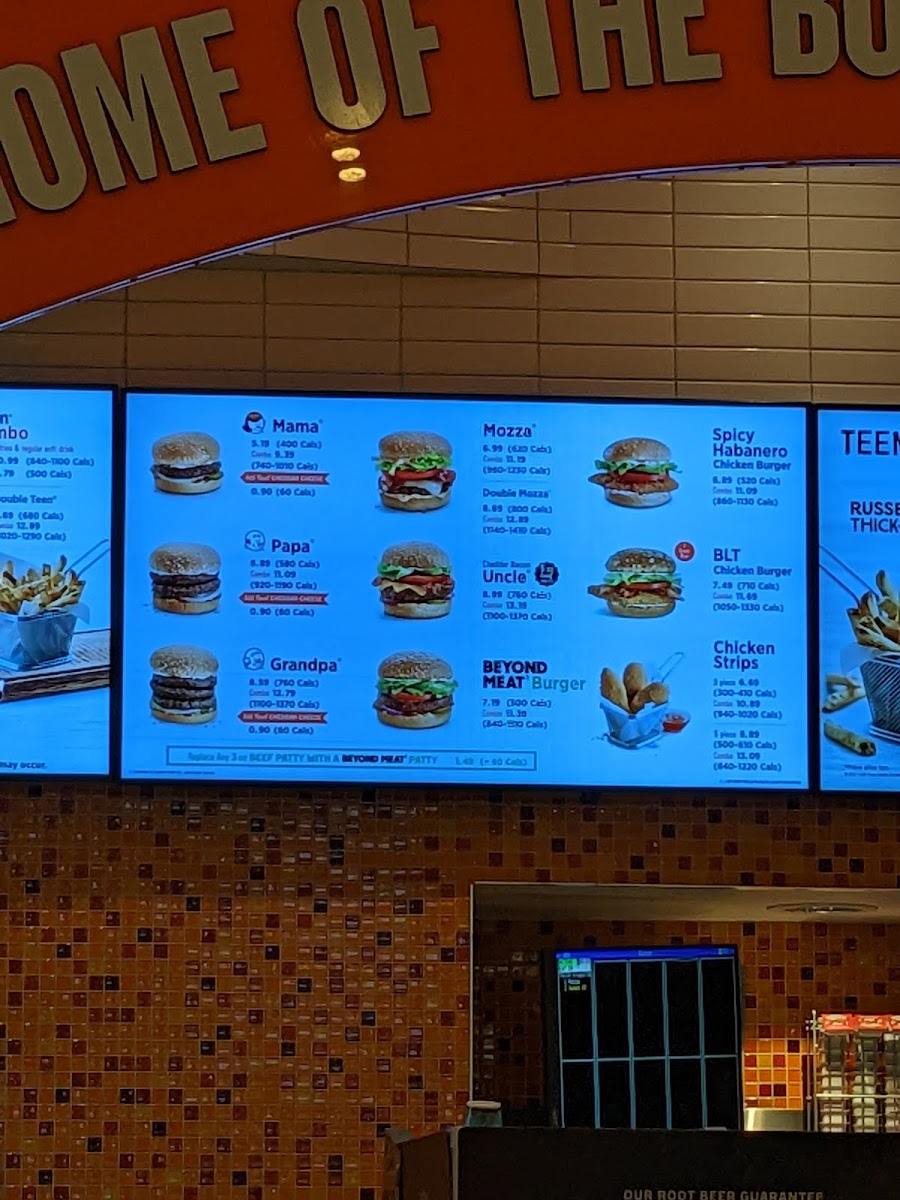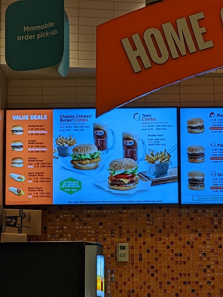 Served with Russet Thick Cut Fries and A&W Root Beer. 1140-1410 cal.